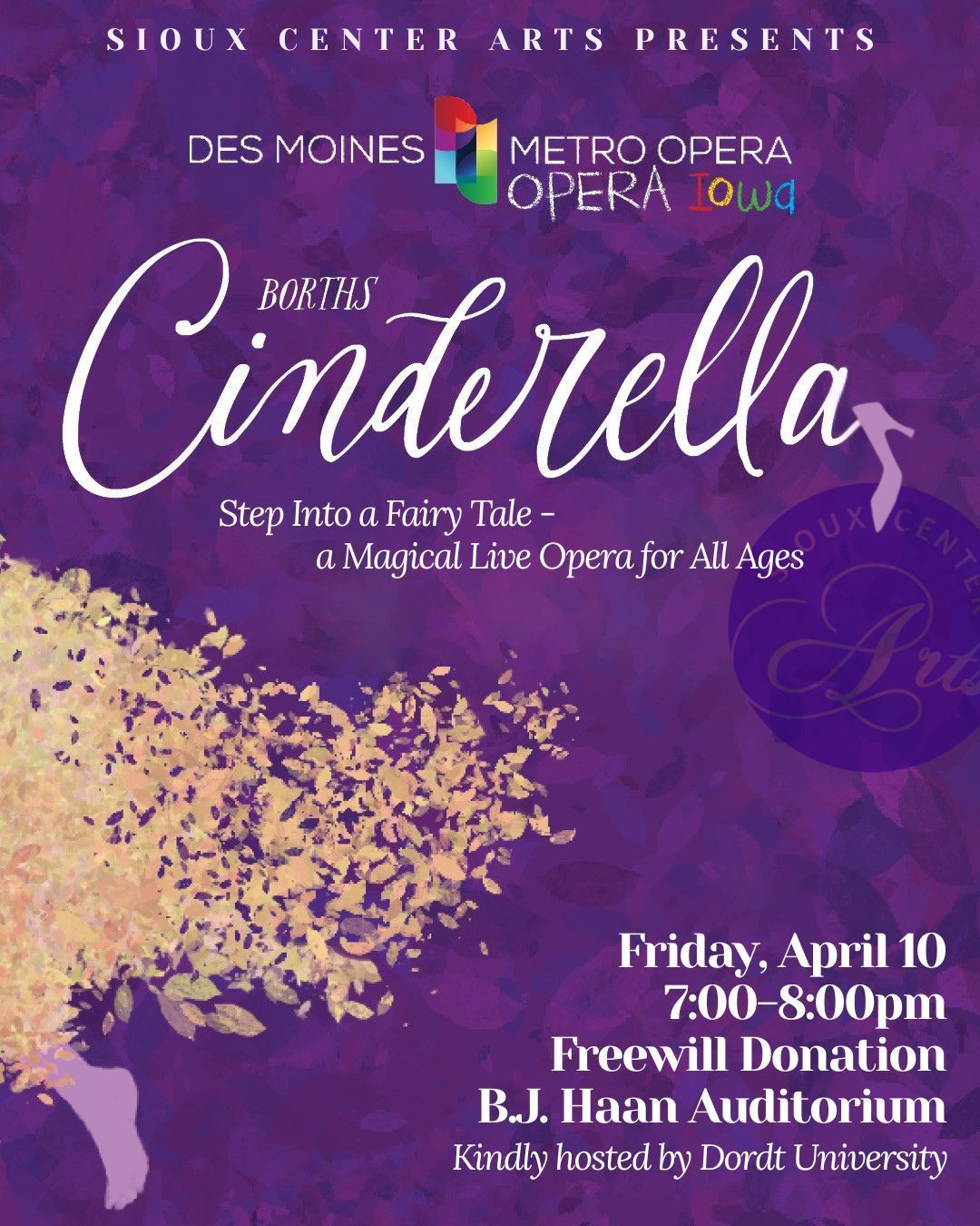 Opera Iowa brings the magic of Cinderella to life in this charming one-hour performance, featuring music by Rossini and Massenet. With delightful storytelling, beautiful vocals, and a touch of fairytale wonder, this production is the perfect introduction to opera for audiences of all ages. Come experience a timeless tale told through music, laughter, and a little bit of magic!
