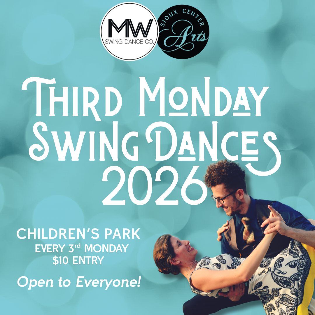 Sioux Center Arts is parternign with Midwest Swing Dance again for Third Monday Swing Dances at Children's Park! Join us for an evening of music, movement and community joy! No experience needed, just come ready to dance!